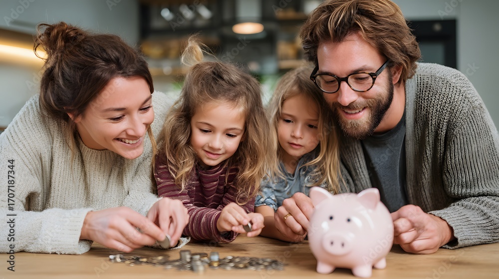 Joyful family with two children saving money together using a piggy bank, smiling while organizing coins on a table at home #1707187344
