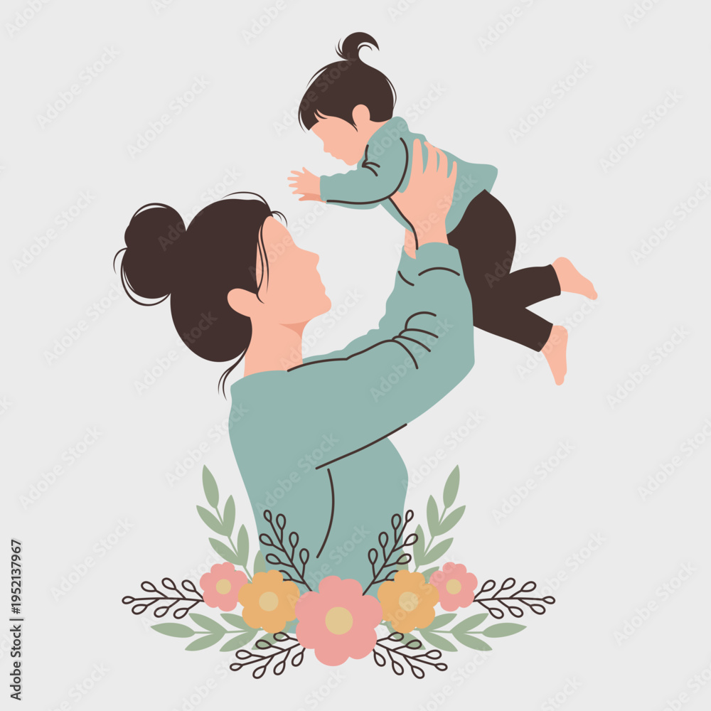 Joyful Mother and Child Bonding with Floral Decor Illustration #1952137967