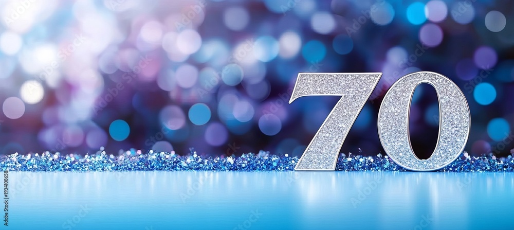 Jubilee Seventy Silver Glitter 70 on Turquoise Background with Purple and Blue Bokeh Effects #1934108658