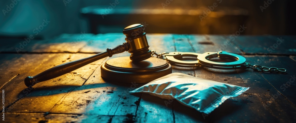 Judge gavel, handcuffs alongside a bag of white powder on a dark surface. Concept of crime, robbery, and drug trafficking. #1320153981