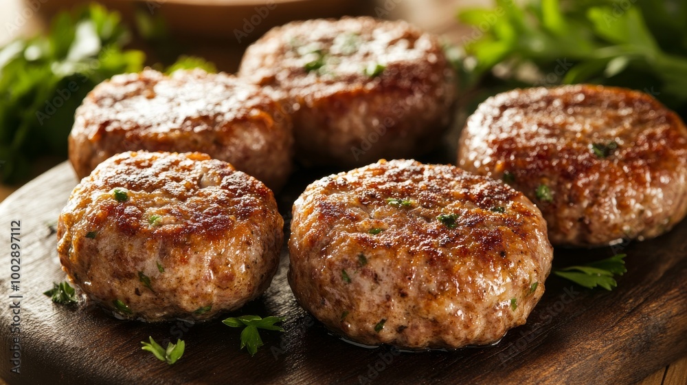 Jugosas hamburguesas de carne molida cocinadas a la parrilla, servidas en una tabla de madera, listas para degustar. #1002897112