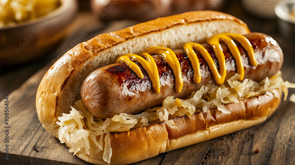 Juicy bratwurst sausages on a bun with sauerkraut, dripping with mustard, hearty and satisfying #958564541