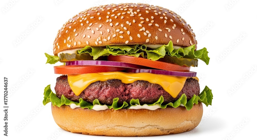 Juicy, gourmet cheeseburger stacked high with fresh lettuce, ripe tomato, onion slices, melted cheddar, and pickles on a sesame seed bun #1770244637