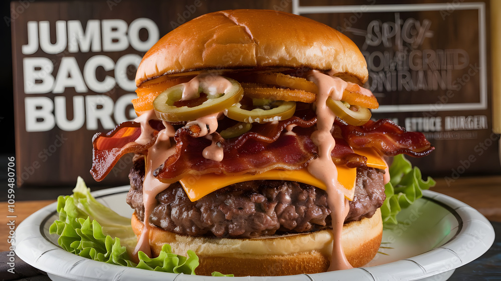 Jumbo Bacon Beef Burger: A jumbo beef patty topped with crispy lamb bacon, pepper jack cheese, chili peppers, onion rings, and topped with spicy ranch sauce on a toasted onion bun. #1059480706