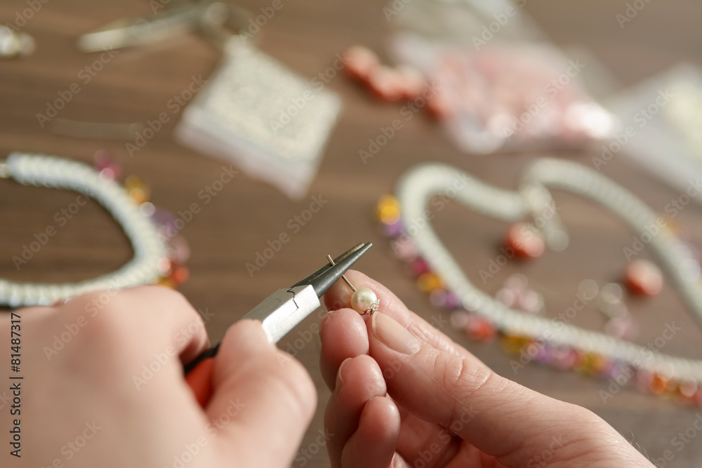 junge Frau bastelt Ohrring, close up, Brandenburg, Deutschland #81487317