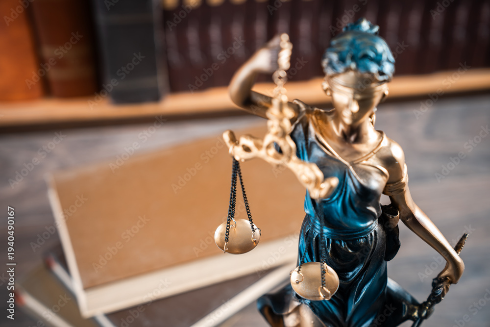 Justice-themed statue with scales, gavel, and books, symbolizing fairness, equality, and the principles of law and moral judgment. #1940490167