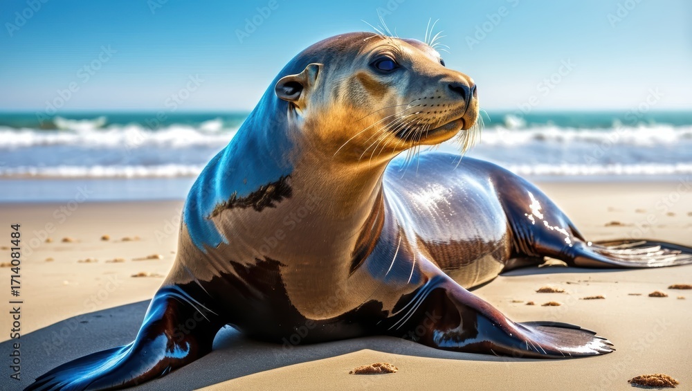Juvenile Sea Lion Resting on Sandy Beach with Ocean Waves and Clear Blue Sky #1714081484