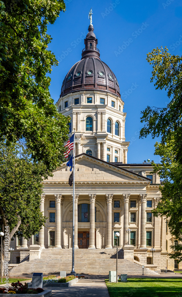 Kansas State Capitol, in Topeka on a sunny day. The Kansas State Capitol is the building housing the executive and legislative branches of government for the U.S. state of Kansas #1791193244