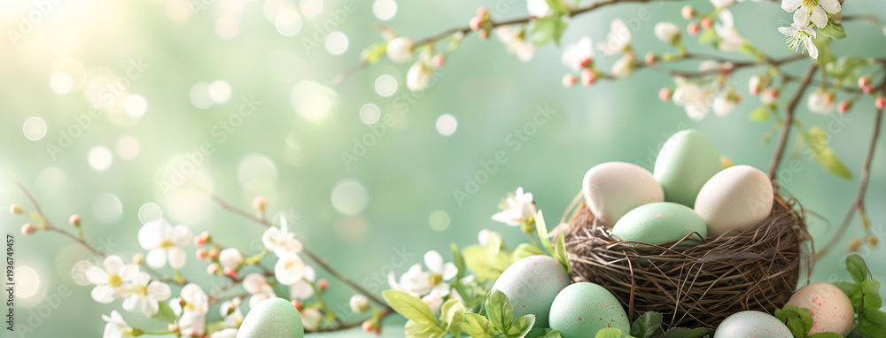 Kartka wielkanocna z gniazdem i jajkami, kwitnąca gałąź, miejsce na tekst, wiosenne tło #1936749457