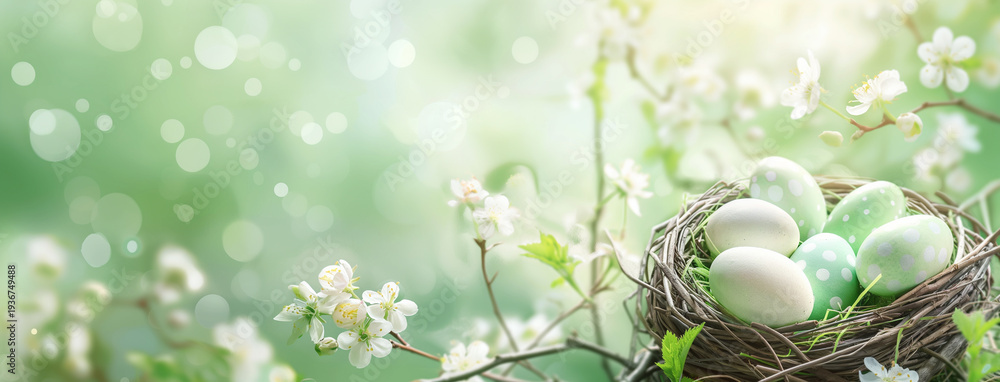 Kartka wielkanocna z gniazdem i jajkami, kwitnąca gałąź, miejsce na tekst, wiosenne tło #1936749488