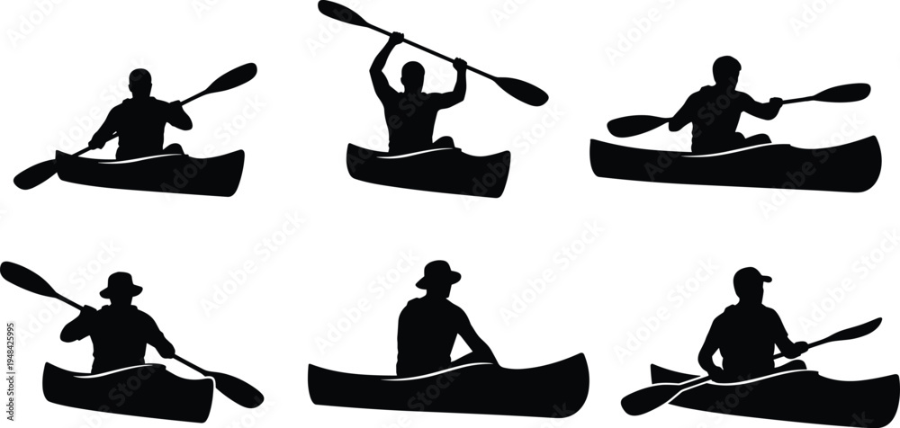 Kayak and canoe paddler silhouettes set outdoor adventure kayaking activity river paddling sportsmen isolated vector illustration collection black water sport #1948425995