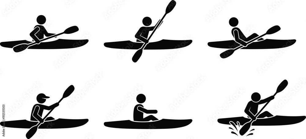 Kayaking icon set, paddler in canoe different poses water sport silhouette isolated on white background vector illustration #1925311303