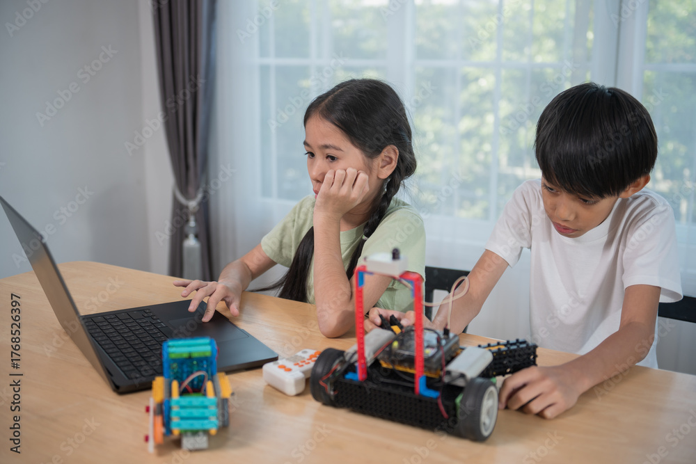 Kid playing with construction blocks on table and hands typing on laptop computer, child playing and building with colorful plastic bricks. #1768526397