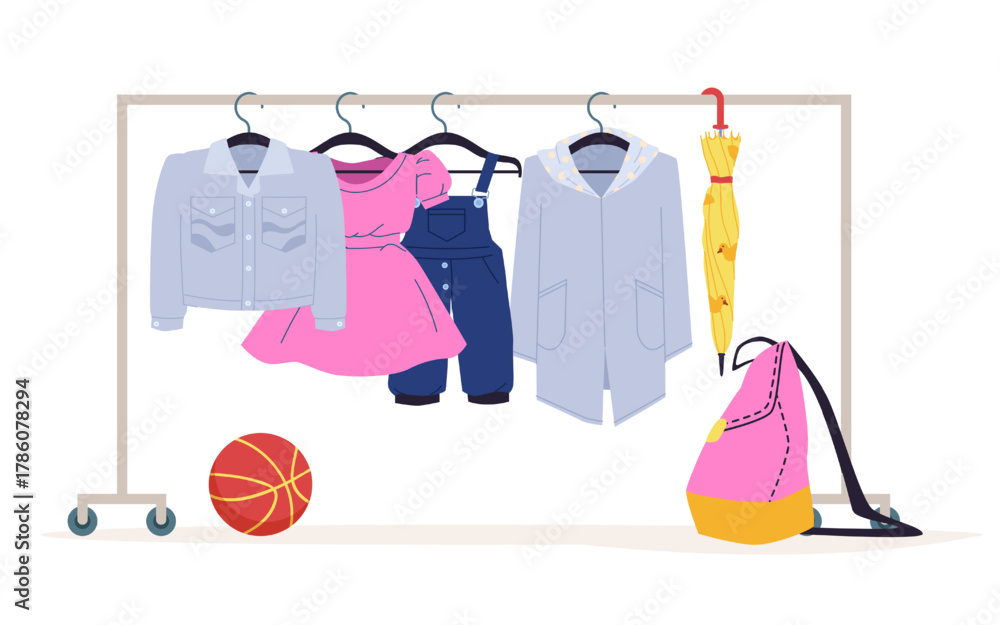 Kids’ denim jacket, pink dress, overalls, raincoat, umbrella, backpack, and basketball displayed on clothing rack, isolated on white background vector illustration #1786078294