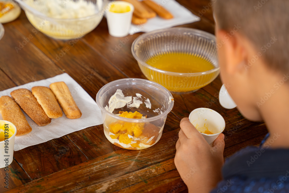 Kids making tiramisu dessert at cooking workshop, hands preparing ingredients on wooden table, family culinary class and learning concept #1905187351