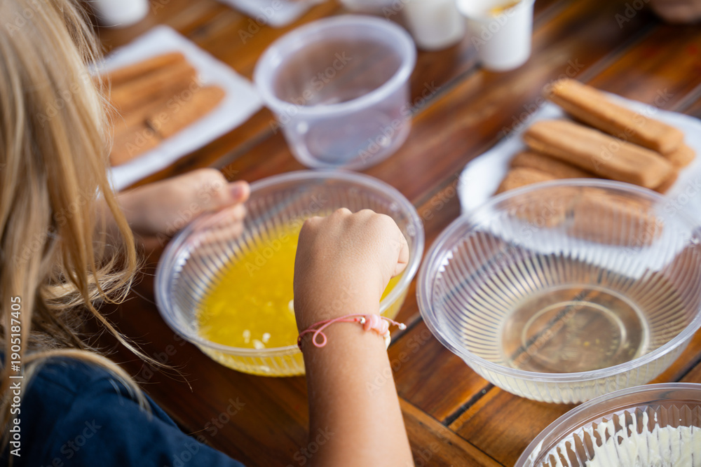 Kids making tiramisu dessert at cooking workshop, hands preparing ingredients on wooden table, family culinary class and learning concept #1905187405