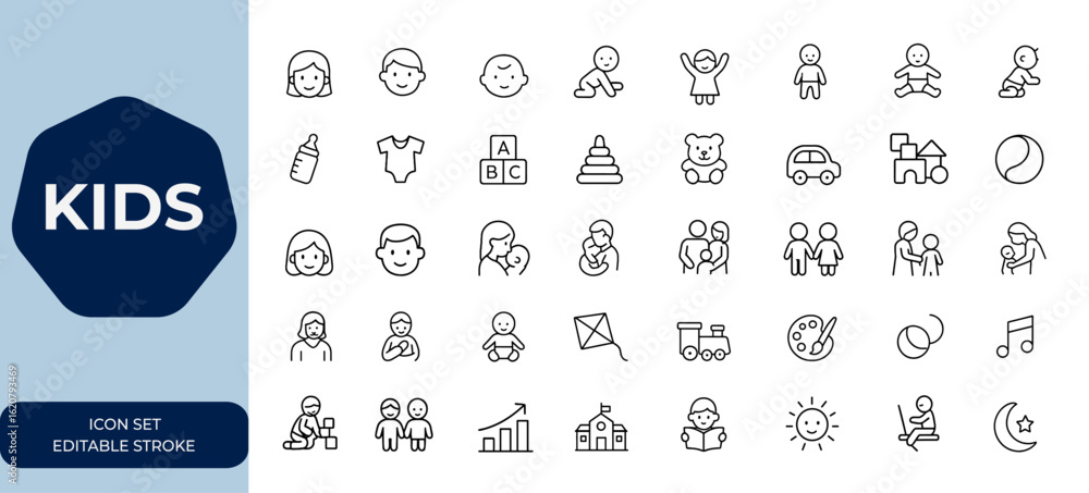 kids Outline linear icon set, editable stroke vector illustrations collection, simple child-themed icons for web design, education, family, playful graphics, modern minimal style and more. #1620793469