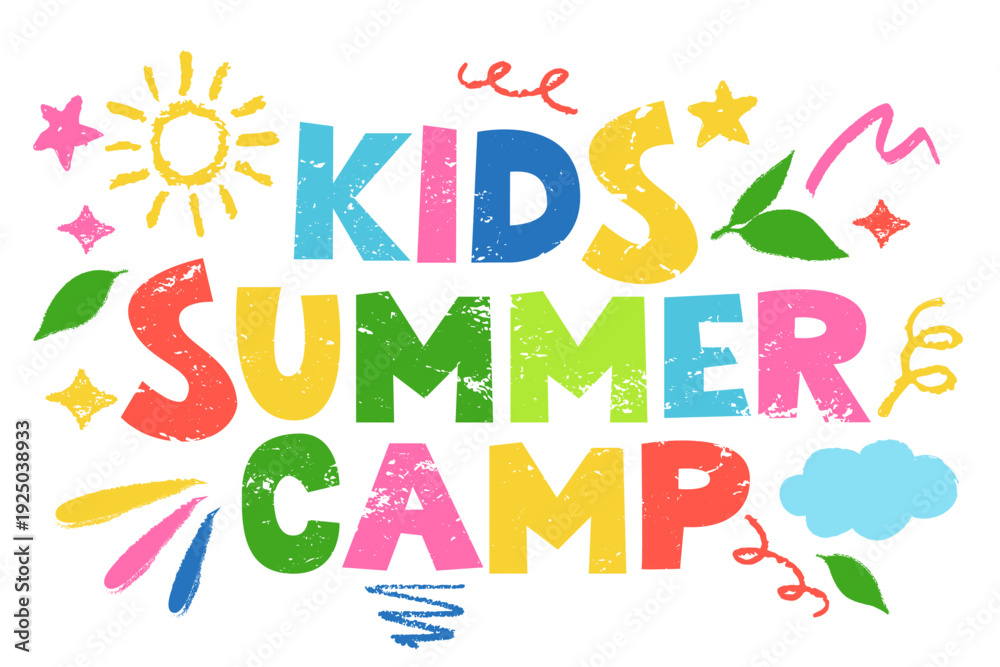 Kids summer camp lettering and crayon design elements. Vector camping illustration for banner, poster, flyer, print #1925038933
