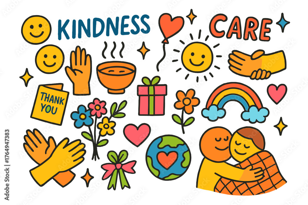 Kindness Icons Illustration. Kindness and care. Colorful Hand-drawn doodle Children illustration Kindness and care helping hands, smiley faces, heart balloon, #1764947383