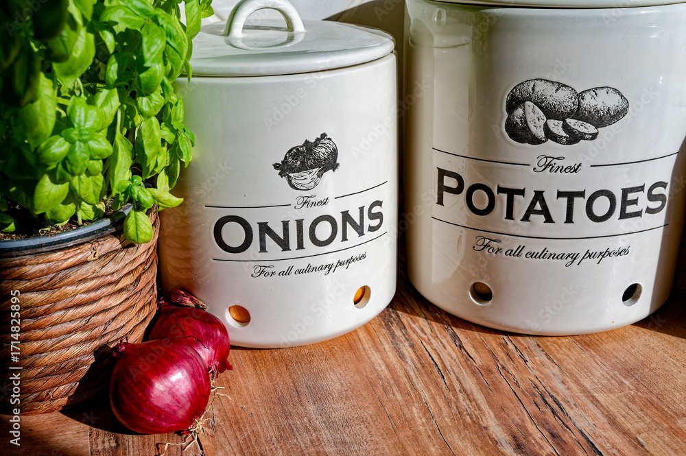 Kitchen worktop with ceramic pots for potatoes and onions. #1714825895