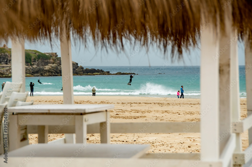Kite surfers in the waves on a windy day. Spectators watch on the sandy beach, Bright colourful kites fill the cloudy sky. Turquoise water. copy space. #1957148911