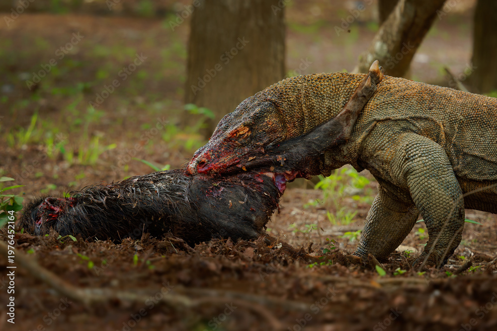 Komodo dragon Varanus komodoensis feeding on wild boar carcass, blood-stained jaws, powerful scaled body, apex predator eating prey, Komodo National Park, Indonesia, endangered #1976452164