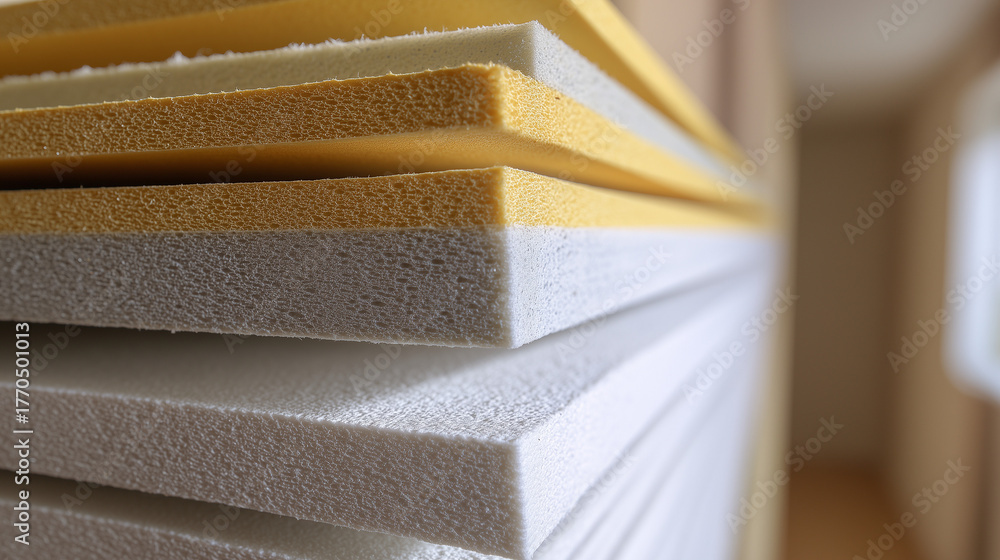 Láminas de espuma en tonos blanco y amarillo, con textura porosa y superficie esponjosa. Utilizadas en aislamiento térmico, embalaje, amortiguación y soluciones técnicas para múltiples industrias. #1770501013