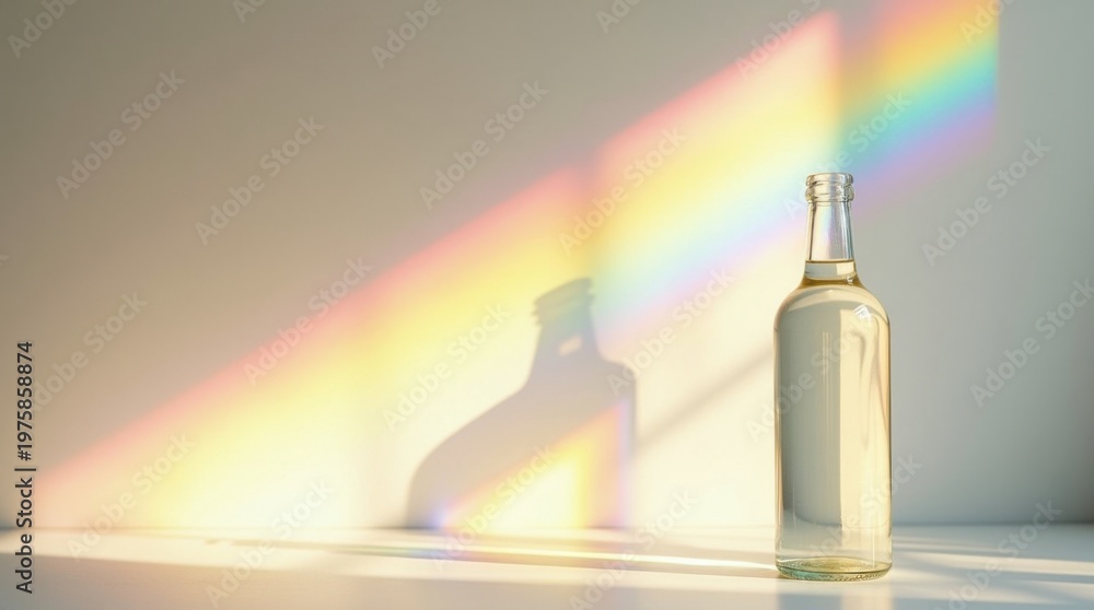 La brillante luz del sol atraviesa una botella de vidrio transparente, refractándose en un vibrante arcoíris prismático #1975858874