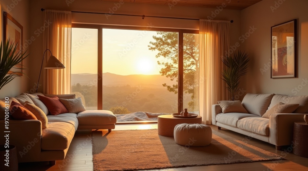 La luz del atardecer entra en el acogedor interior de la casa #1970016180