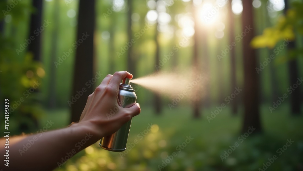 La mano de una persona aplicando repelente de insectos en aerosol contra un fondo borroso de árboles de un bosque denso #1714199879