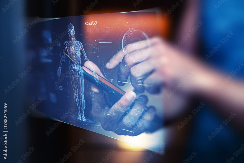 La mano navega el cuerpo digital: interacción médica, datos humanos y tecnología aumentada en tiempo real.Persona usa smartphone con holograma anatómico, interfaz futurista, datos visibles. #1738274059