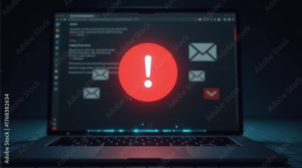 La pantalla de una computadora portátil muestra un ícono de advertencia de correo electrónico rojo prominente sobre un fondo gris oscuro, que simboliza un intento de phishing #1768382634
