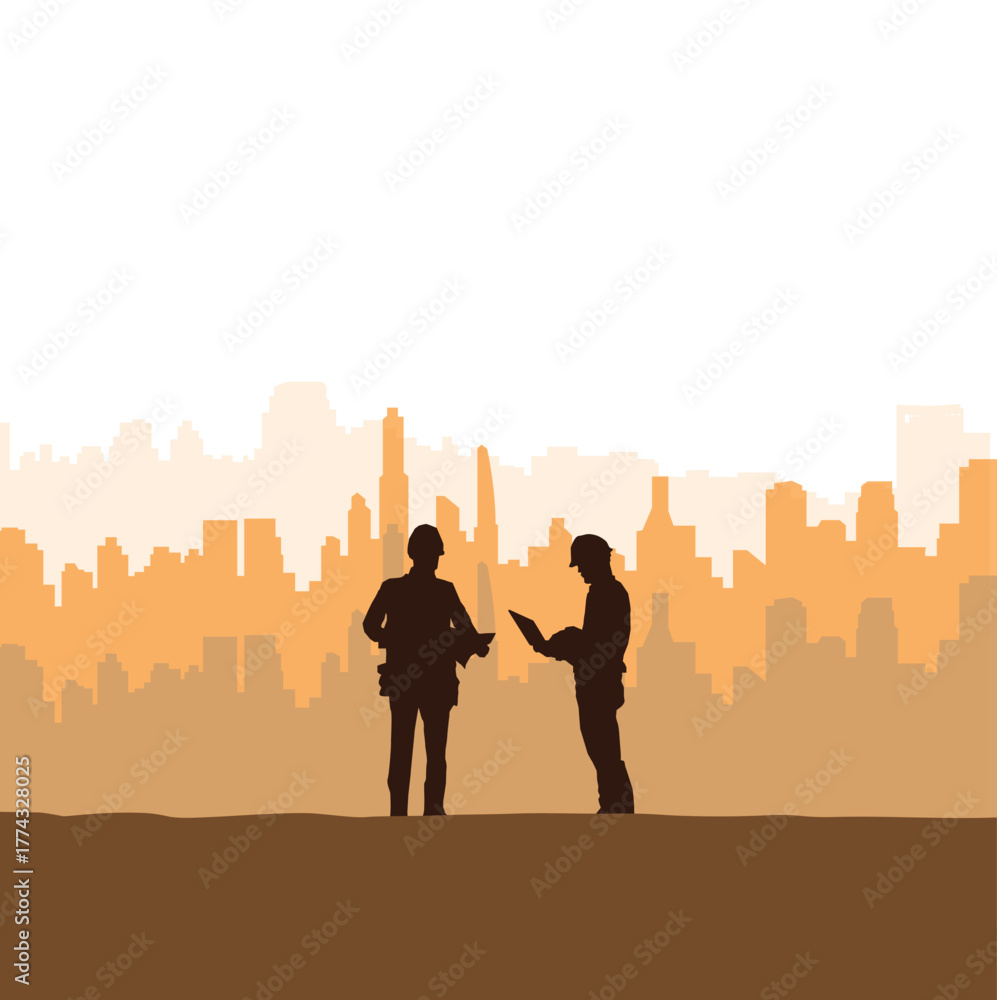 Labour Day Two professionals—one with a laptop, one with blueprints—stand before a layered city skyline, symbolizing urban collaboration at dusk. #1774328025