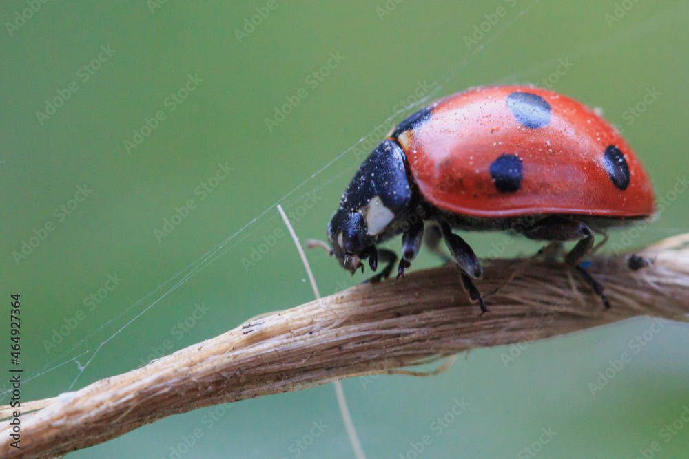 ladybug on an old twisted thread macro side view on a green background #464927364