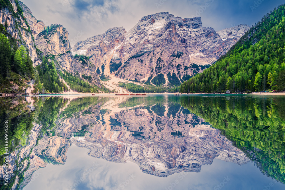 Lago di Braies, Italy. Alpine lake with emerald waters, dramatic Dolomites peaks, wooden boats, and breathtaking scenic beauty. #1969914328