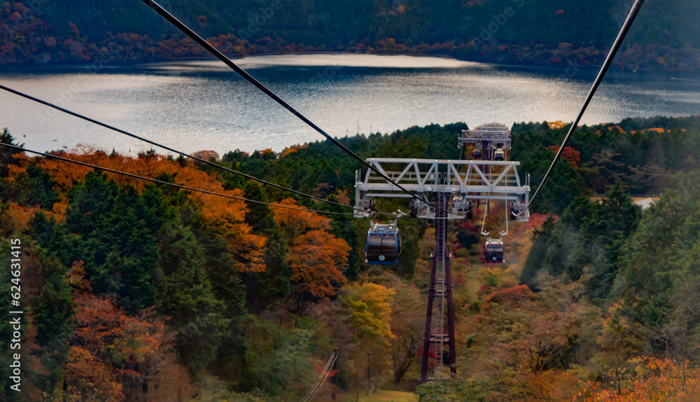 Lake Ashi and surroundings from Hakone Ropeway or cable car in Hakone in autumn season #624631415