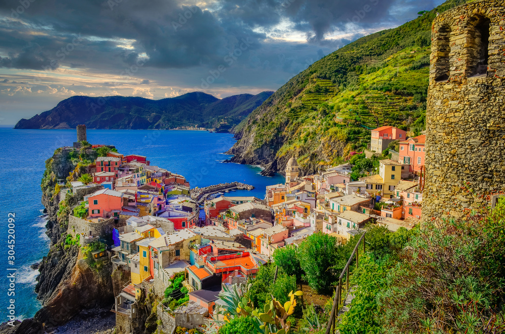 Landscape view of colorful village Vernazza with dramatic sky in Cinque Terre #304520092