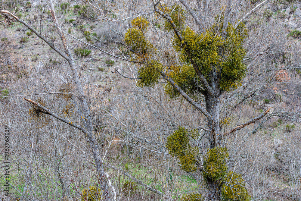 Landscape with poplar covered with the semi-parasitic plant white mistletoe. Viscum album. #1967968029
