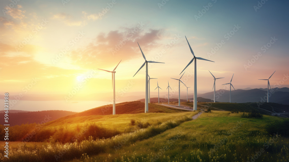 landscape with renewable and sustainable energy with wind turbines on mountain. generative ai #596821988