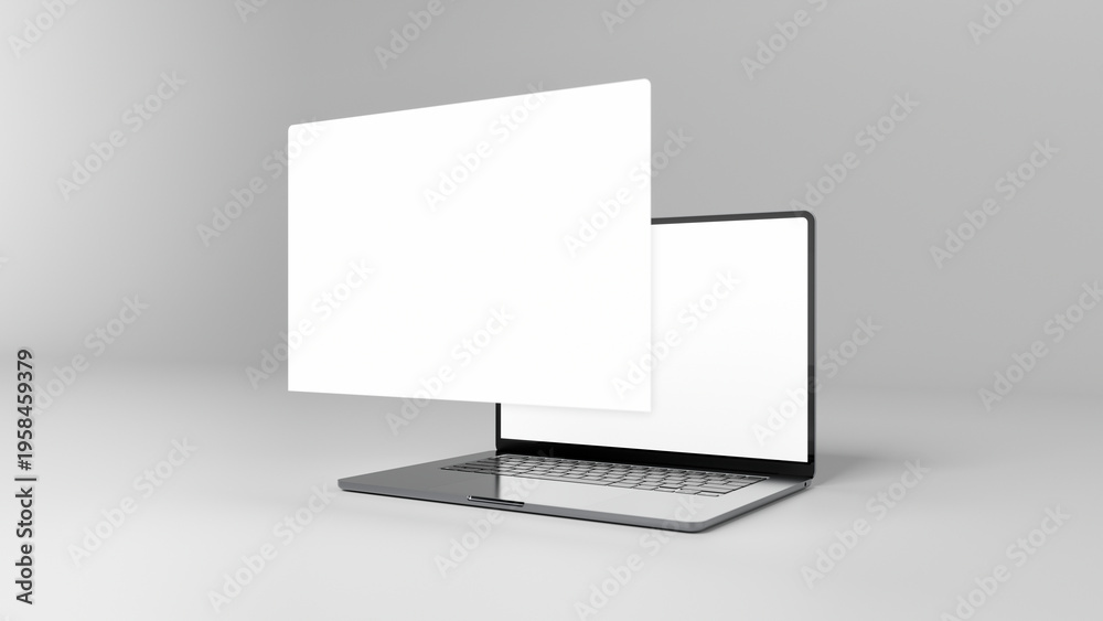 Laptop with blank floating screen panel, digital presentation mockup and web design concept. #1958459379
