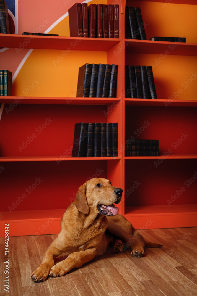 large brown dog lying in a vibrant orange library. Loyal pet looking towards with bookshelves in the background. Modern home interior and domestic animal portrait. Vertical #1944238142