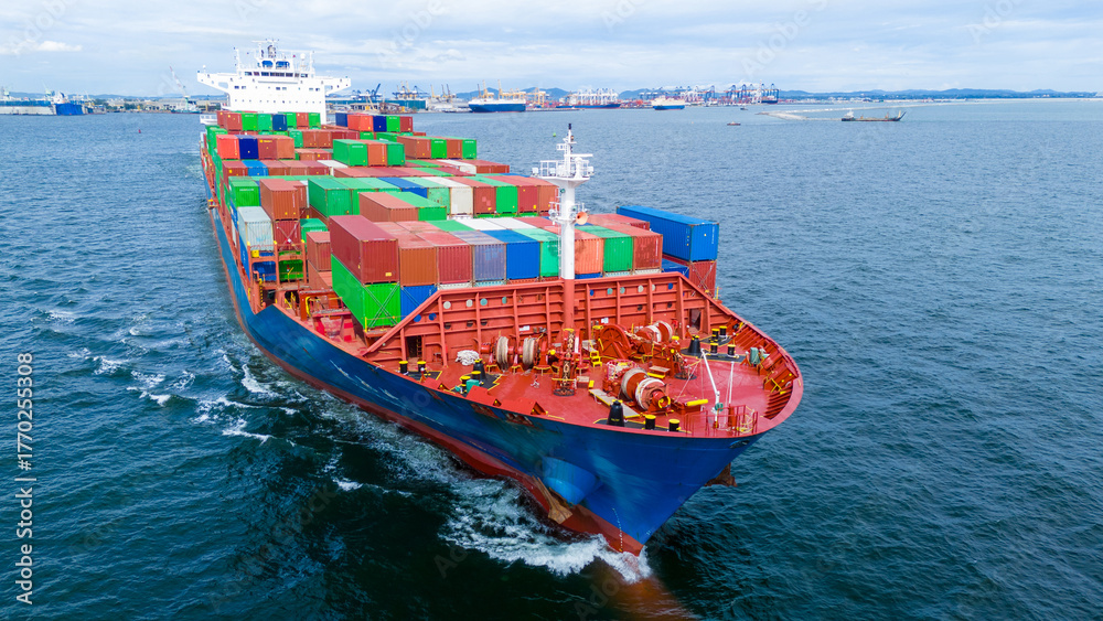 Large container cargo ship sailing in ocean with colorful freight boxes. Ideal for global logistics, maritime shipping, international trade, export-import business, and transportation concepts. #1770255308