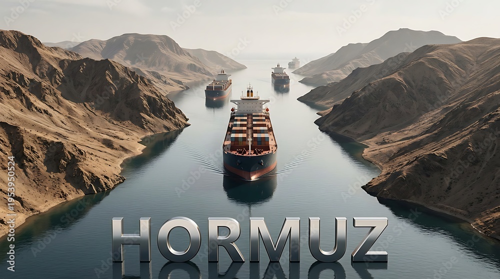 Large container cargo ships navigating through narrow canal with steep rocky cliffs on both sides under bright daylight sky, international trade route transportation #1953950524