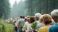 Large diverse group of faceless volunteers of all ages gathered at a forest edge holding saplings, preparing to plant, defocused misty forest behind, World Environment Day, forest conservation, #1935255789