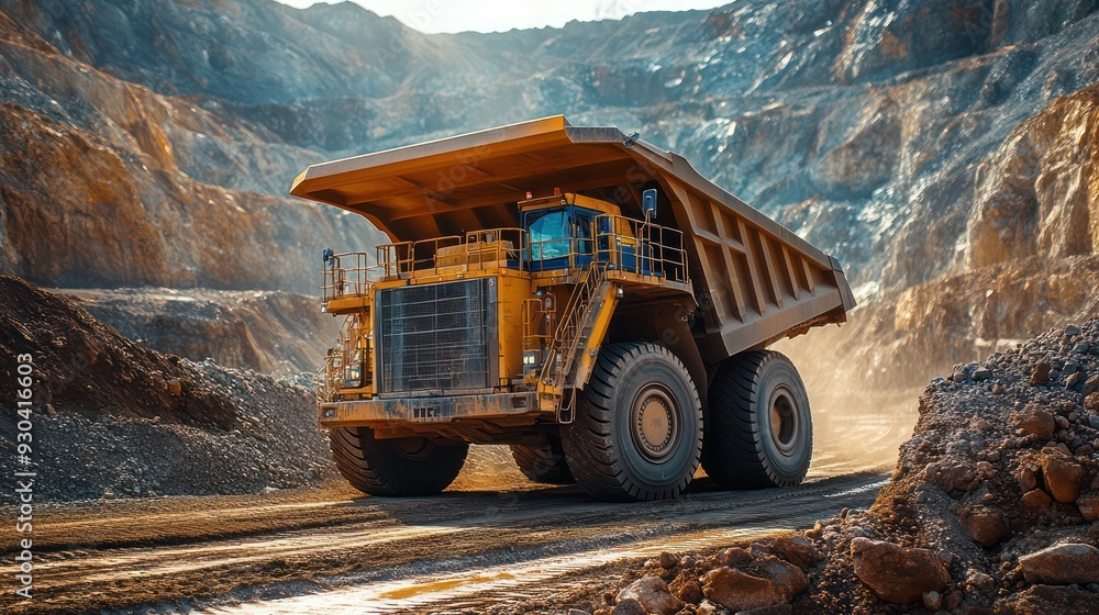 Large dump truck filled with ore driving through a quarry, highlighting transportation in the mining industry. #930416603