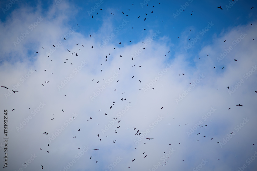 Large flock of corvus birds catched against sky in Hungary countryside #1761922149