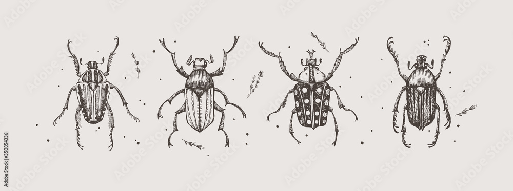 Large set of hand-drawn beetles on a light isolated background. Insects vector illustration in vintage style. Design element for zoological composition, poster, cover, brochure. #358854336