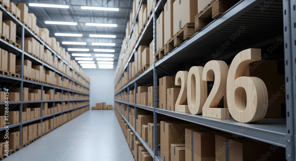 2026, Large warehouse shelves filled with boxes and the year 2026 prominently displayed, 2026 new year #1788684154