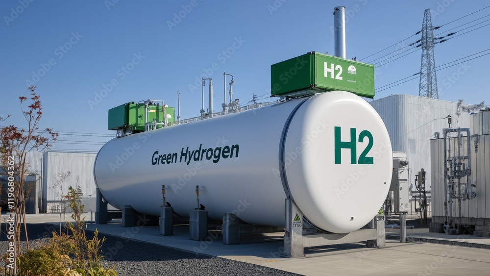 Large white tanks storing h2 for green hydrogen production at a modern industrial plant, contributing to clean energy and sustainable practices #1196804362