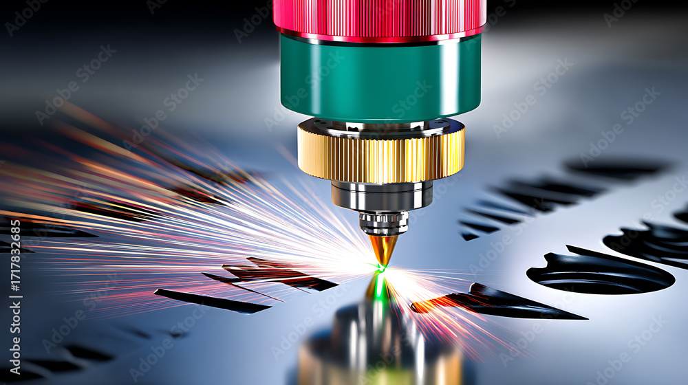 Laser cutting machine in action, precisely engraving metal with bright sparks and focused light beam #1717832685